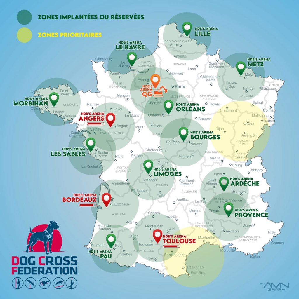 La carte présente les zones où des arenas DCF sont déjà implantées ou réservées, ainsi que les secteurs prioritaires pour de futures ouvertures.
