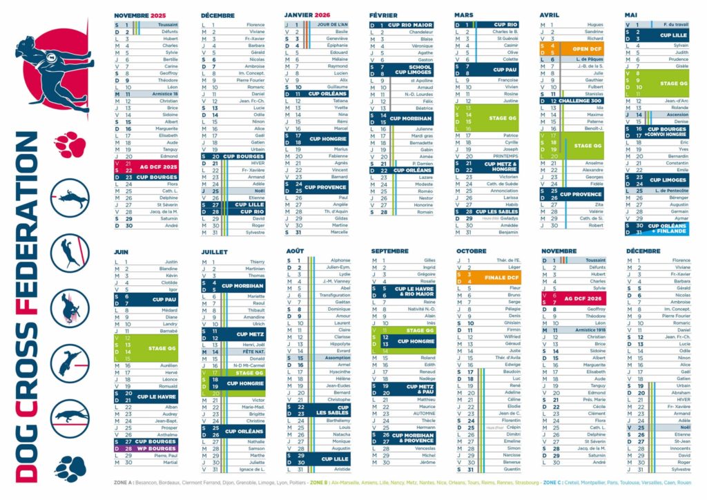 Chaque ligne correspond à une compétition officielle ou un stage de la Dog Cross Fédération.